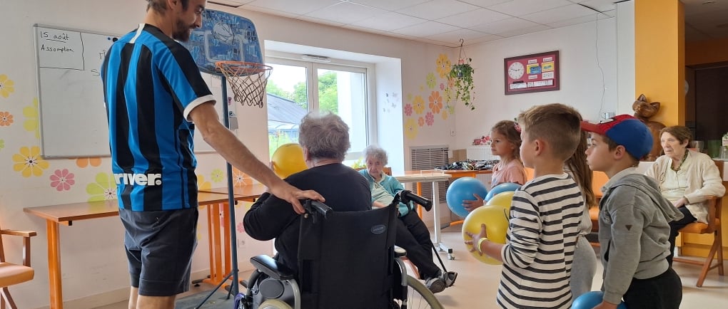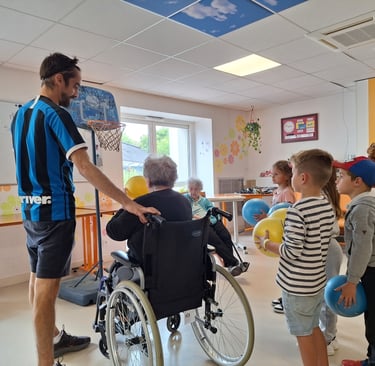 Au programme de lâaprĂšs-midi : plusieurs ateliers sportifs adaptĂ©s, mĂȘlant mouvements doux, jeux dâadresse et petits dĂ©fis en duo. RĂ©sidents et enfants ont ainsi pu former de vĂ©ritables binĂŽmes complices, unis par lâenvie de bouger ensemble et de sâamuser.