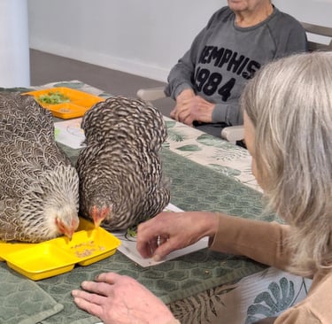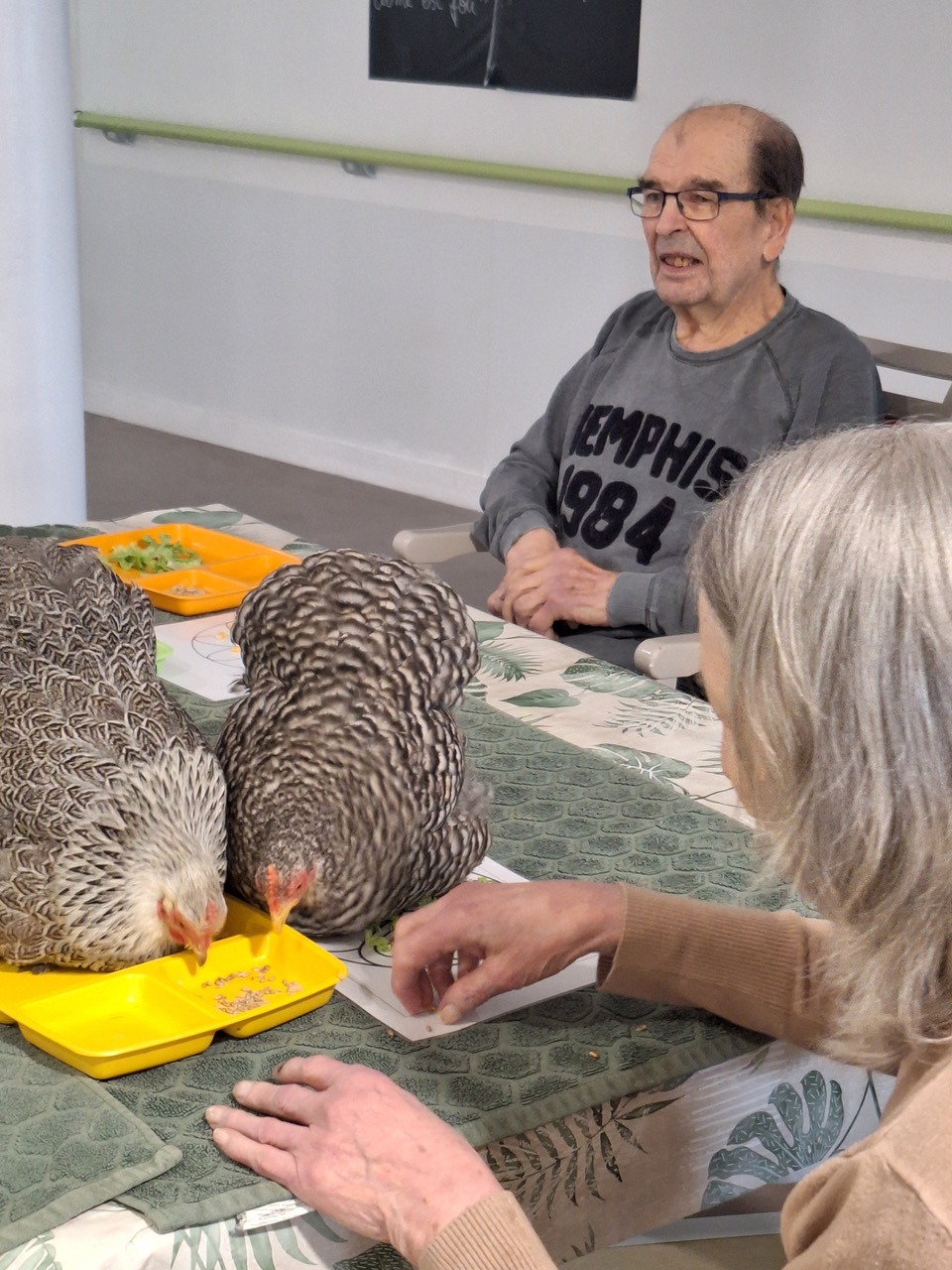 Poules, lapins et autres compagnons viennent régulièrement à la rencontre de nos résidents, créant un climat propice à l’apaisement et aux souvenirs heureux.